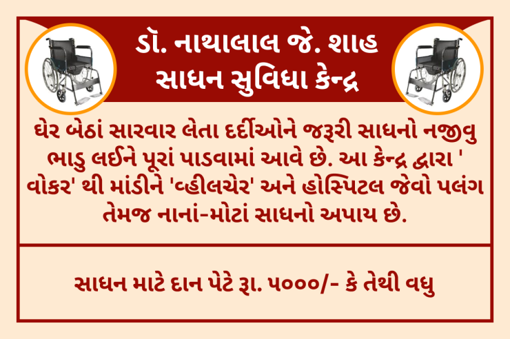 ડૉ. નાથાલાલ જે. શાહ સાધન સુવિધા કેન્દ્ર દર્દીઓને ઘરે જ જરૂરી સાધનો પૂરા પાડીને તેમની સંભાળ રાખવામાં મદદ કરે છે. આ સેવા સંપૂર્ણપણે દાન પર આધારિત છે, જેનો અર્થ છે કે દર્દીઓ પાસેથી કોઈ ભાડુ વસૂલવામાં આવતો નથી.