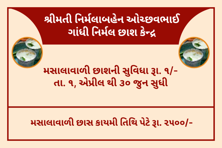શ્રીમતી નિર્મલાબહેન ઓચ્છવભાઈ ગાંધી નિર્મલ છાશ કેન્દ્ર તમને 1 એપ્રિલ થી 30 જૂન સુધી માત્ર ₹1 માં સ્વાદિષ્ટ મસાલાવાળી છાશ પીવાની તક આપે છે.